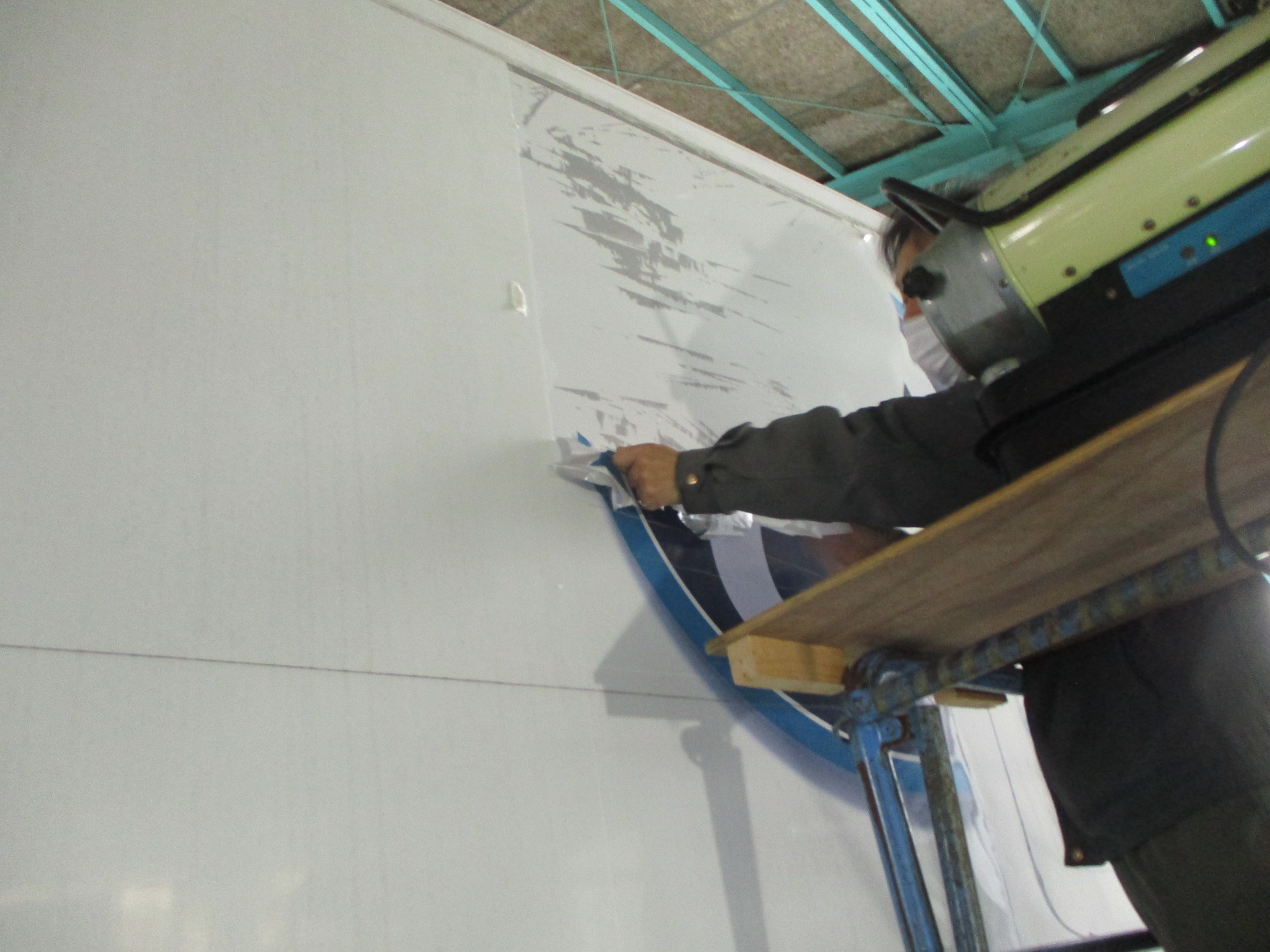 JET ヒーターで軽く熱を加えながら ラッピングを畳2畳分程剥がします。